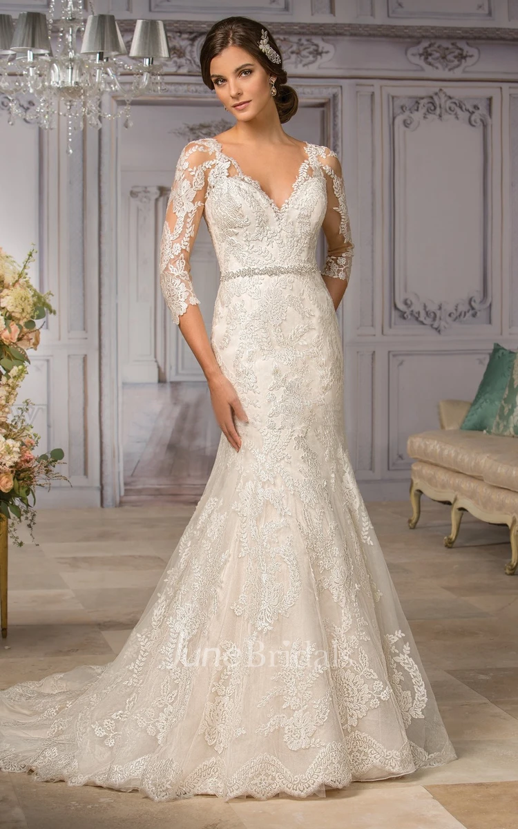 3-4 Sleeved V-Neck Mermaid Spring Wedding Dress With Appliques And Bow