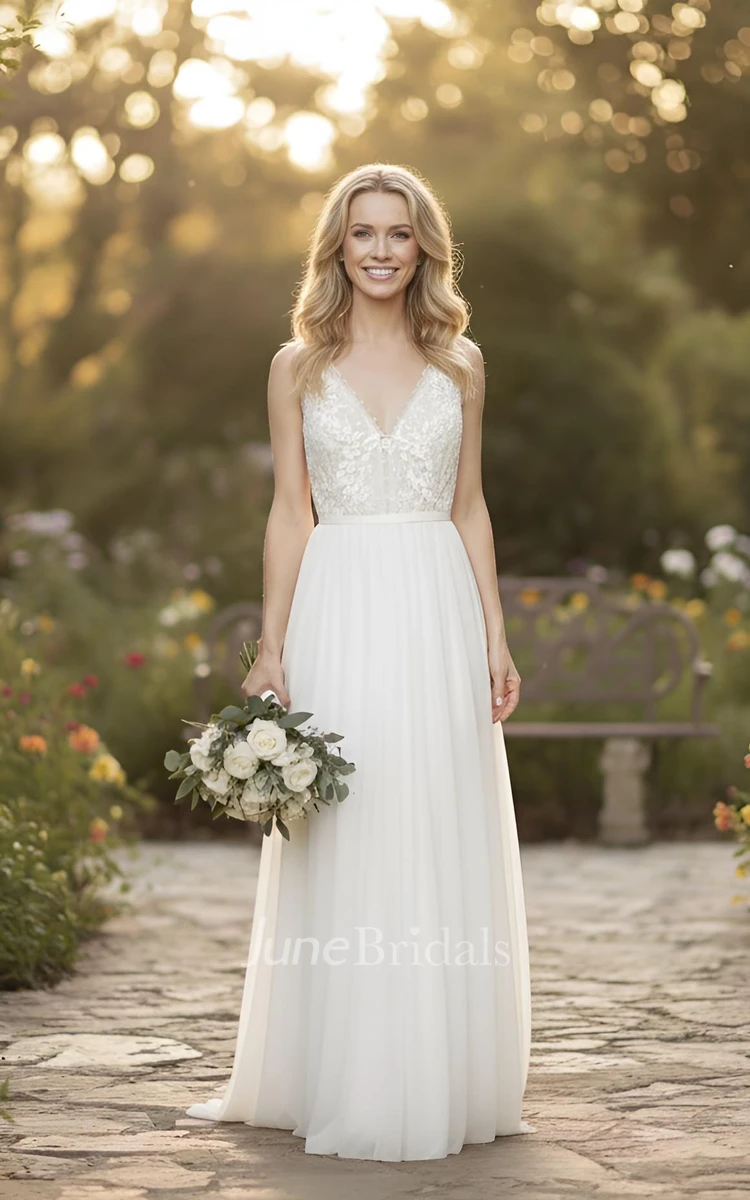 A-Line Lace Wedding Dress V-Neck Sleeveless Chiffon Gown for Garden & Outdoor Wedddings