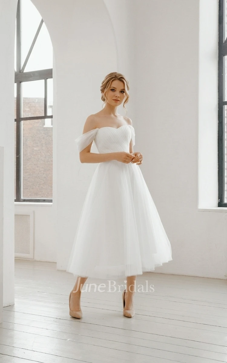 1950s Tea Length Wedding Dress A-Line Off-the-Shoulder Tulle Gown with Coset Back for Civil Ceremony