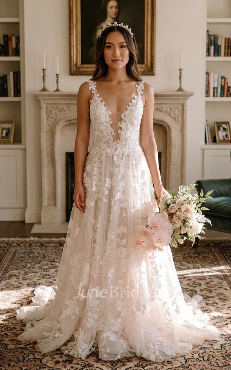 Boho Floral Lace A-Line Wedding Dress Sleeveless Plunging V-Neck Bridal Gown with Open Back
