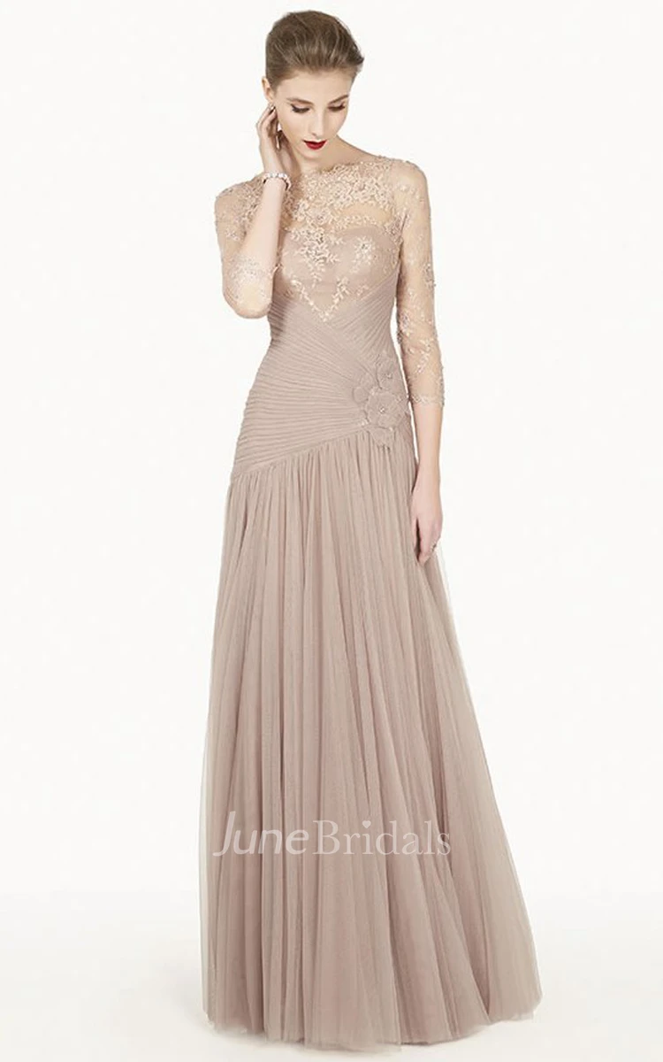 Lace Top Tulle Long Prom Dress with Illusion Back and 3-4 Sleeve