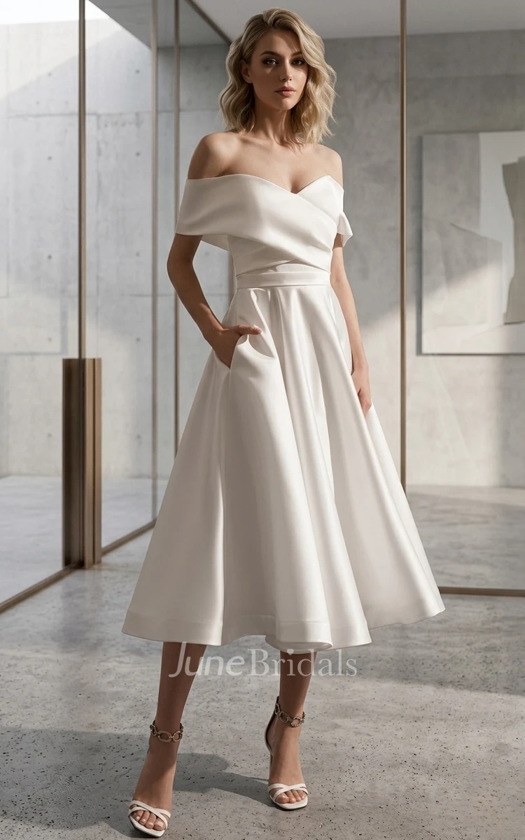 Minimalist Off-the-Shoulder Tea-length Wedding Dress Modern A-Line Criss Cross Satin Gown