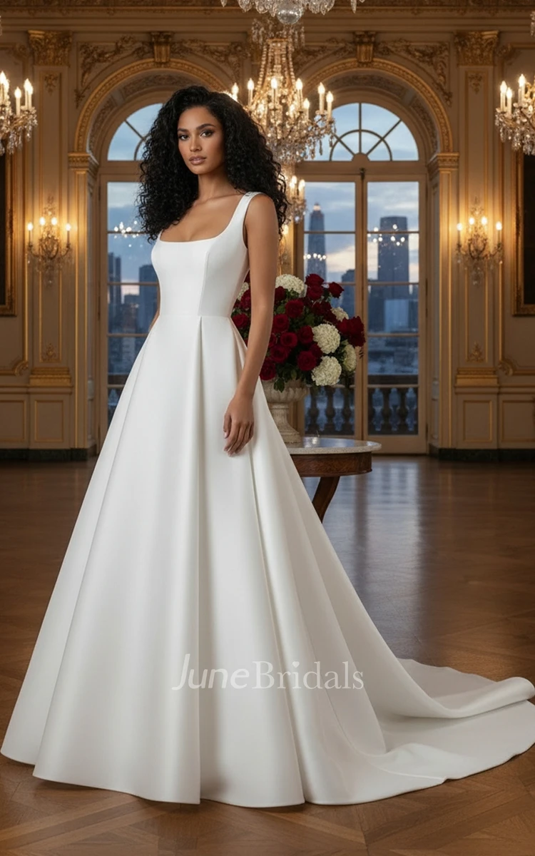 Minimalist Square Neck Wedding Dress Sleeveless A-Line Satin Bridal Gown