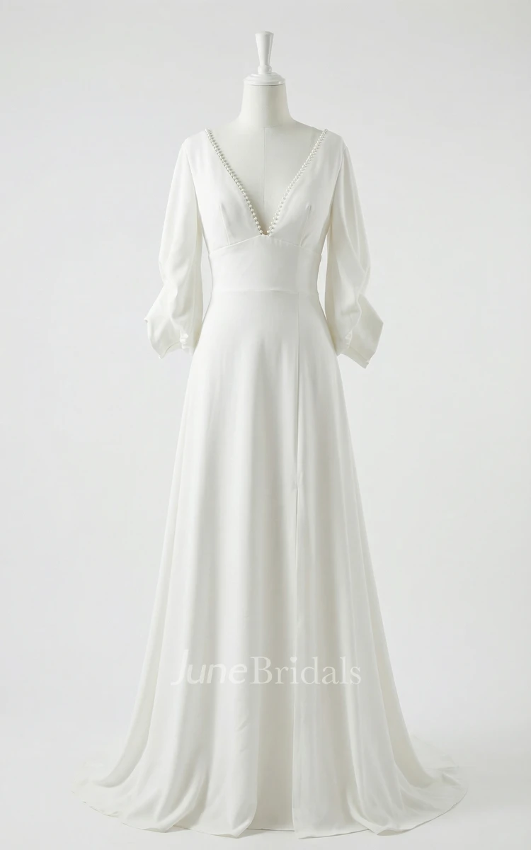 Modern A-Line V-Neck Wedding Dress with Ruched Balloon Sleeves and Cuffs